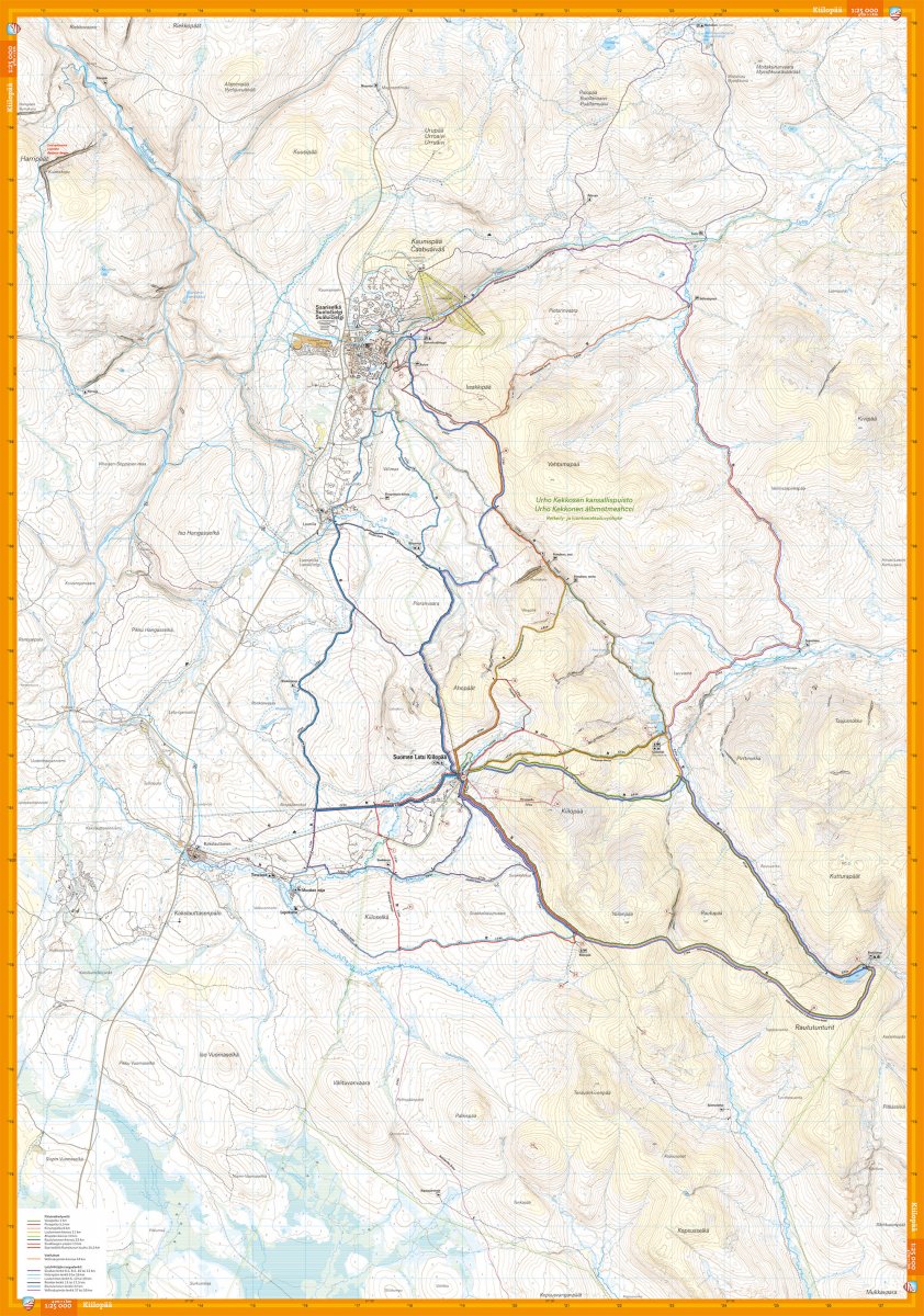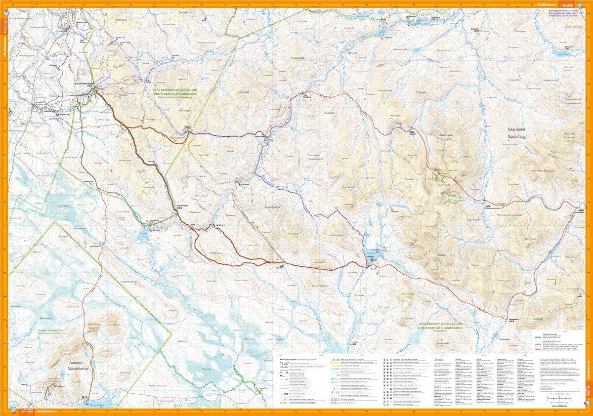 Kirjaan liittyvällä kartalla reitit esitetään kätevästi omalla tunnusvärillään. Näin hahmotat helposti, millaisen lenkin kukin rengasreitti tekee. Etupuolella on 1:50 000 -mittakaavainen kartta, joka ylettyy kauas Sokostin taakse. Tähän karttaan on merkitty suositellut vaellukset sekä Sompion päiväretkireitit. Taustapuolen Kiilopään lähiympäristön tarkempimittakaavaisella (1:25 000) kartalla näkyvät päiväretket ja hiihtoretket. Kartan sivussa on lueteltu alueen autiotuvat perustietoineen ja koordinaatteineen.