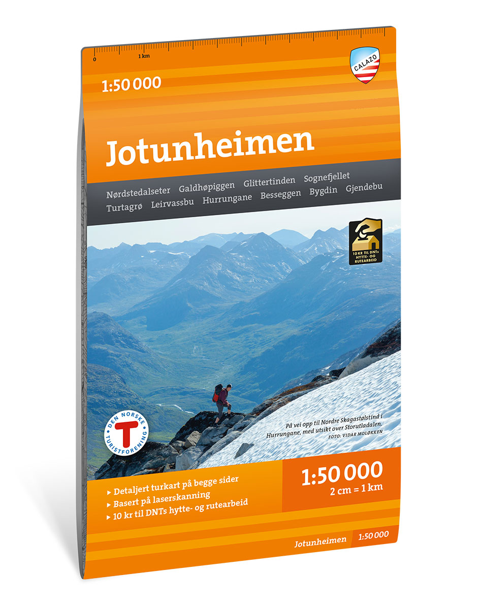Dette kartet dekker hele Jotunheimen med kartvisninger på både for- og baksiden. Det er en del av den moderne kartserien fra Calazo, med unik terrenginformasjon basert på laserskanning fra fly og bedre presisjon i detaljene.