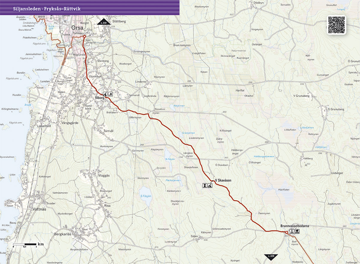 Varje karta i denna­ bok är försedd med en QR-kod. Skanna koden med ­mobilkameran så kan du enkelt följa turförslaget i telefonen.