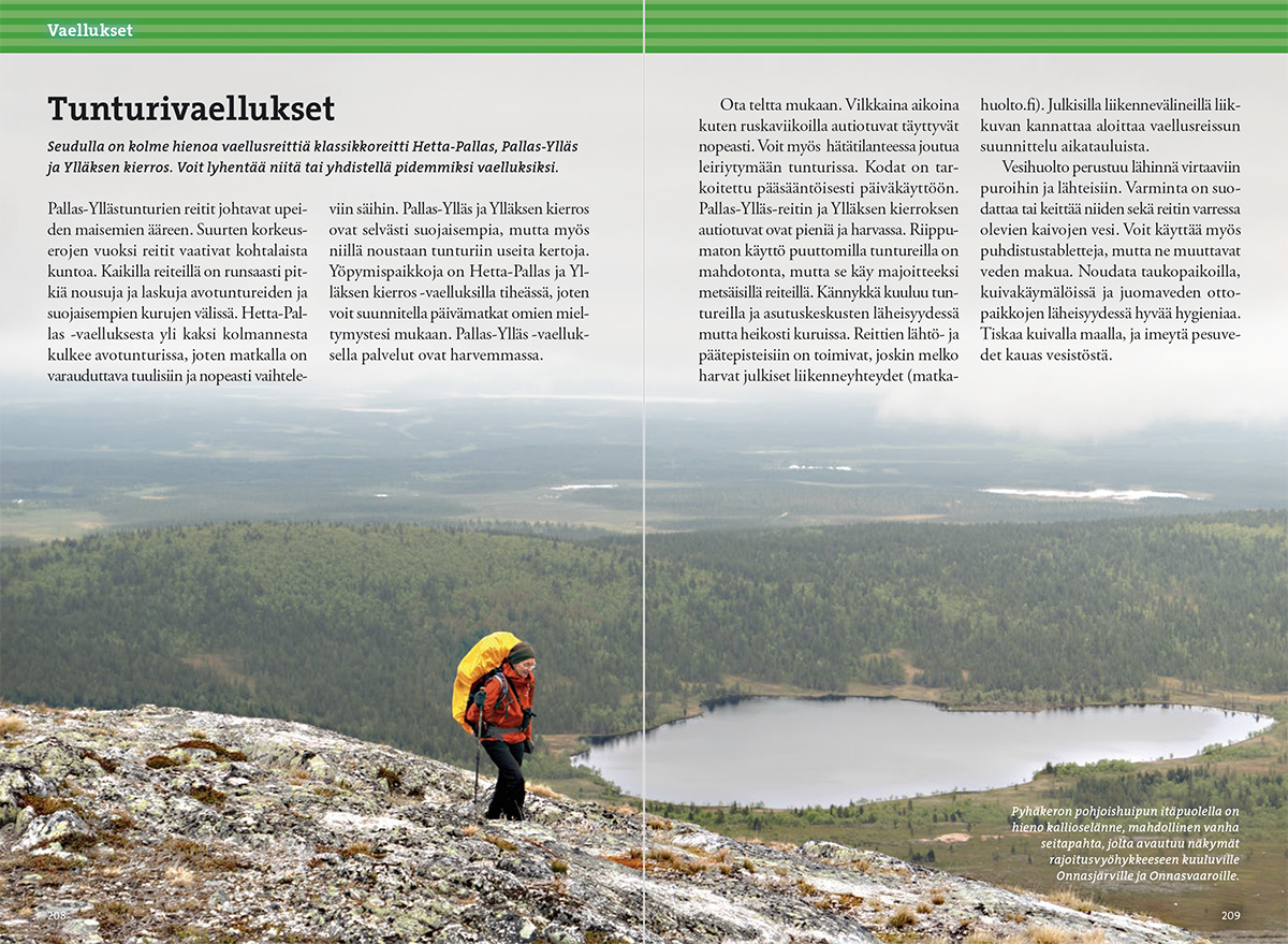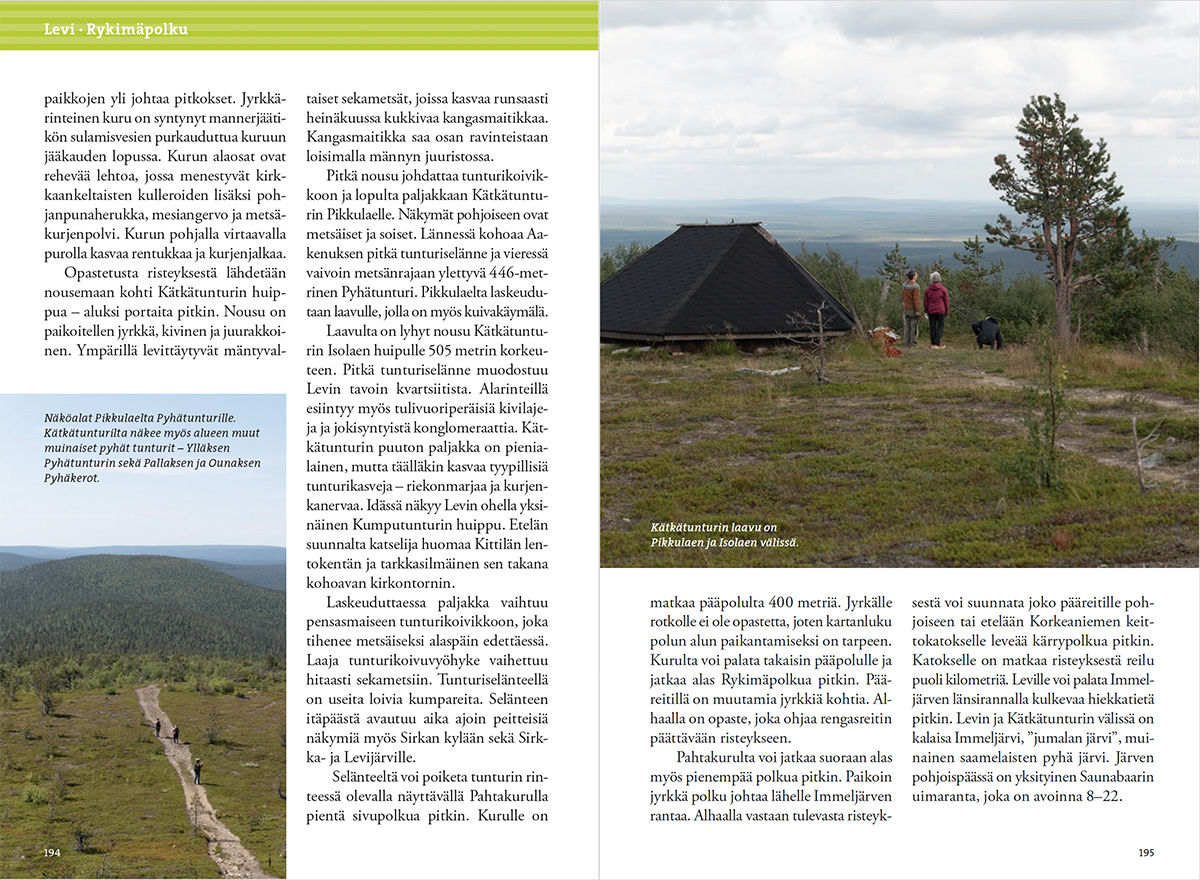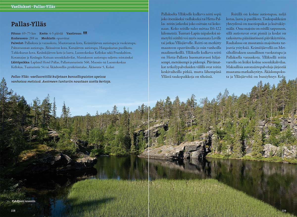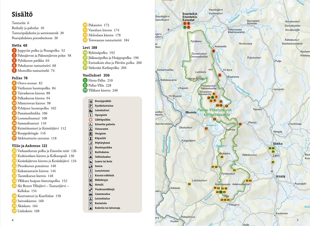 Opaskirja esittelee 46 päiväretkireittiä ja 3 vaellusreittiä. Ne käsittävät kansallispuiston ja sitä ympäröivät kesäretkeilyreitit ja -kohteet sekä Hetan ja Levin merkityt patikkareitit. Neljään maantieteelliseen osaan jaettu kirja sukeltaa myös seudun luontoon ja historiaan sekä antaa retkineuvoja.