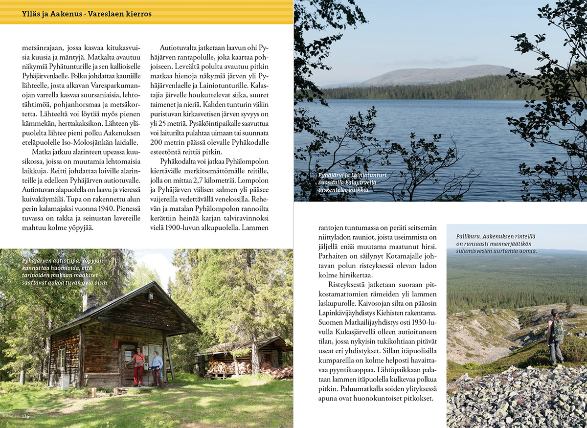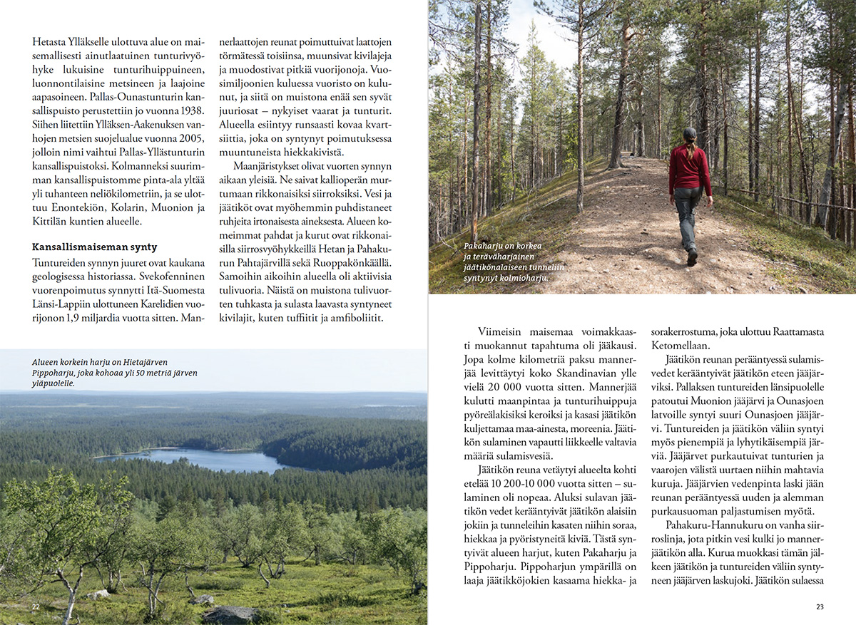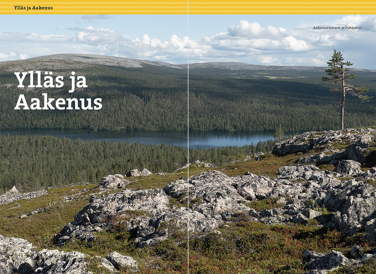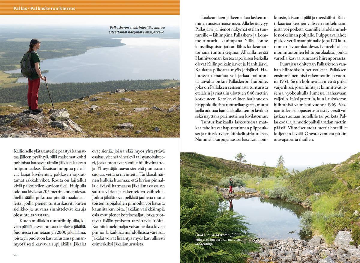 Opaskirja esittelee 46 päiväretkireittiä ja 3 vaellusreittiä. Ne käsittävät kansallispuiston ja sitä ympäröivät kesäretkeilyreitit ja -kohteet sekä Hetan ja Levin merkityt patikkareitit. Neljään maantieteelliseen osaan jaettu kirja sukeltaa myös seudun luontoon ja historiaan sekä antaa retkineuvoja.
