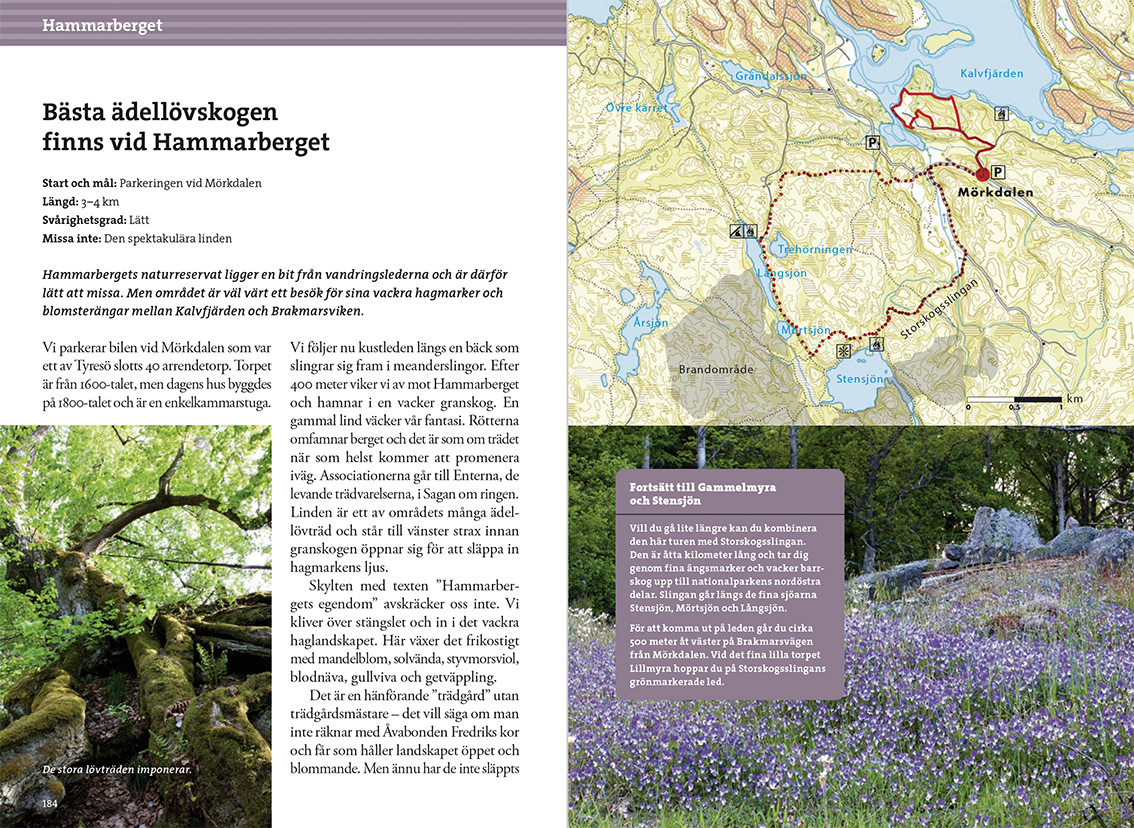 Många av turförslagen i boken tar dig utanför de mest uppenbara och vältrampade stigarna – förhoppningen är att boken ska ge vidgat perspektiv och uppmuntra till nya upptäckter. Vid sidan av vandringsturerna får du även tips på några cykelturer, ett par skidturer och en längre kajaktur. Författarna gör också nedslag i områdets kulturhistoria och guidar dig till botaniskt intressanta platser.